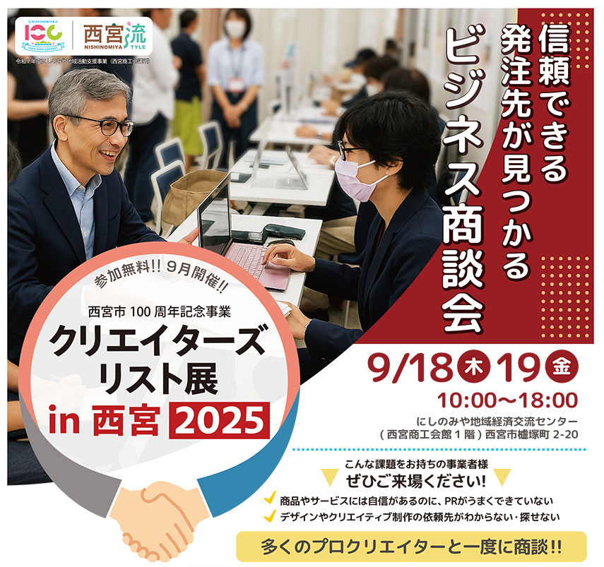 9月18日(木)、19日(金)に西宮商工会議所で開催の商談会「クリエイターズリスト展in西宮2025」に出展しました。