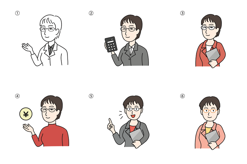 FPらしいちゃんとした業務内容をイメージしつつ、親しみやすい印象をご希望されていたので写真を元に似顔絵を一から描き起こして何パターンか制作しました。最終的に選ばれたのは「5」のイラストです。