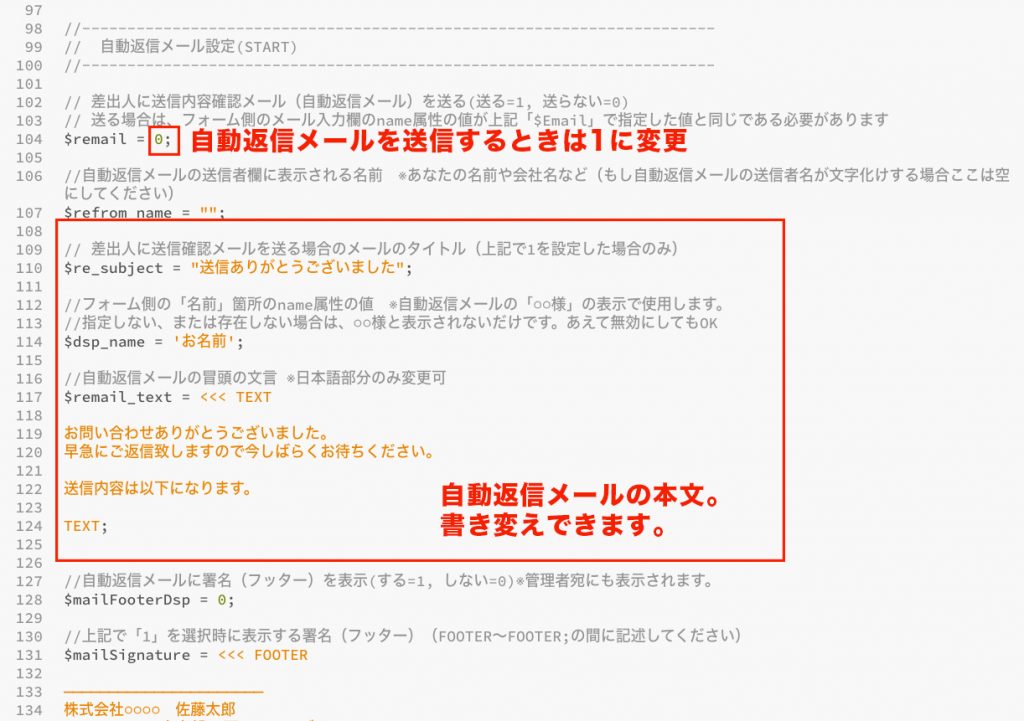 「mail.php」をテキストエディタで開いて、メールの送信先とホームページのアドレスを変更します。