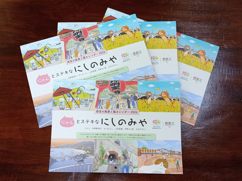 西宮の風景と猫を、地元イラストレーター6人が描く、西宮の風景と猫カレンダー「にゃんとステキなにしのみや」カレンダーが今年も完成しました!