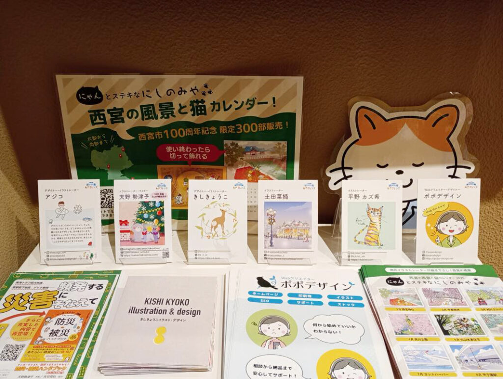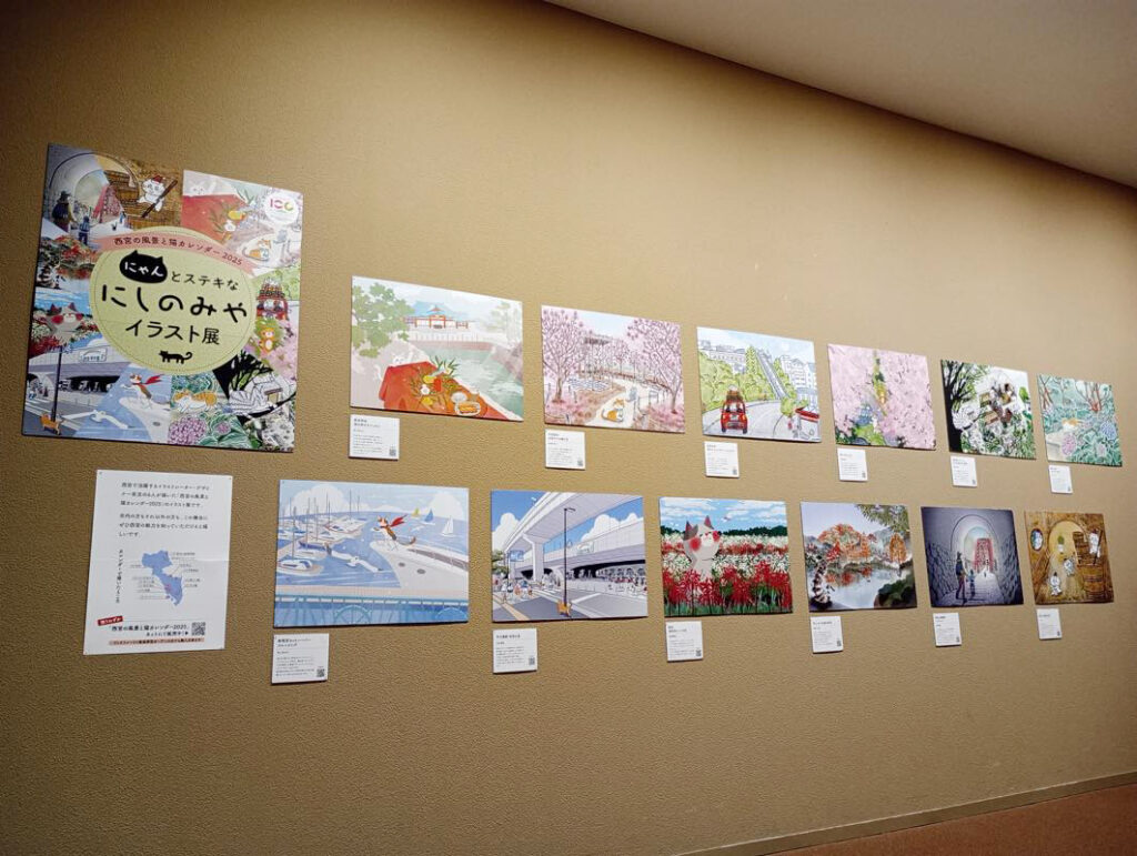 西宮の風景と猫を描いたイラストを展示しています。知っている人も知らない人も、西宮の魅力を見ていただけると嬉しいです。