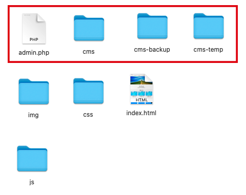 最低限動作させるのに必要なファイルは「admin.php」と「cms」フォルダです。