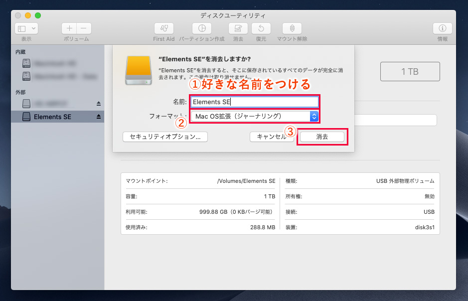 消去するか聞いてくるので使いたい名前をつけて、フォーマットを「Mac OS拡張(ジャーナリング)」を選んで「消去」ボタンを押します。これで完了です。