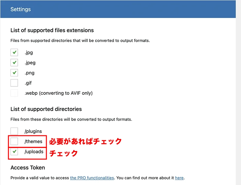 設定をしていきます。画像は/upload内に入るので、基本的にはほとんどそのままで良いです。/themes内にも画像をたくさん入れているようならチェックを入れます。私は入れませんでした。