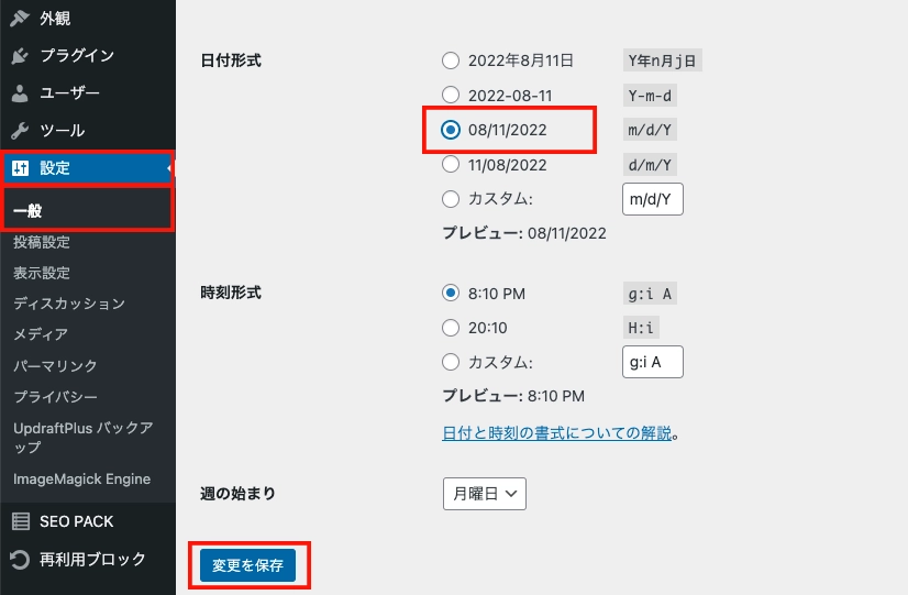 日付を日本語以外の表記に変更して、変更を保存ボタンを押せば完了です。お疲れさまでした。