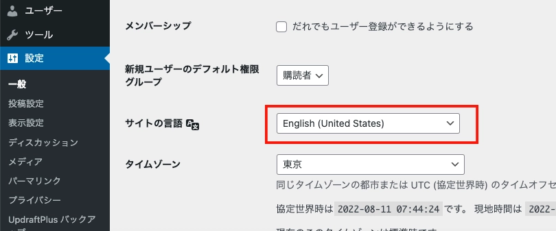 忘れないように、WordPress管理画面の「設定」→「一般」からサイトの言語をEnglishに変更します。